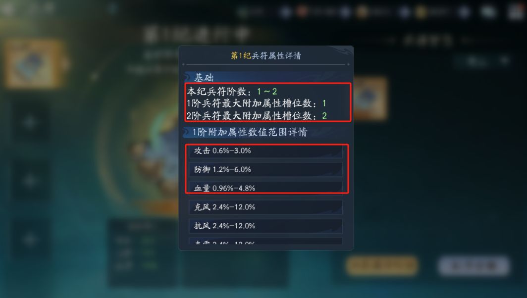 兵符阶数决定兵符的基础属性,附加属性词条数、附加属性生成的随机数值范围