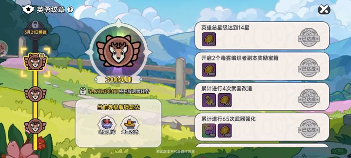 🦌英勇之地破晓测试,英勇纹章只可以到20阶灵鹿,明天5.00解锁后续。