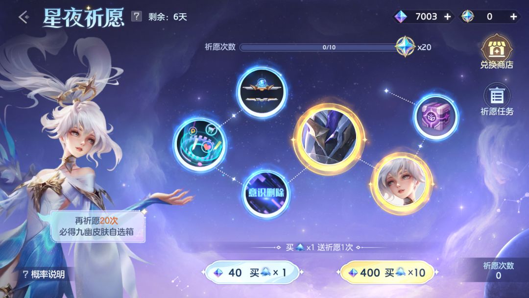 祈愿可累积幸运值,满幸运值时将获得大量银辉晶石,晶石用于祈愿商店兑换天工皮肤残影·斩妖御魔行、刘备·崩坏之源、美杜莎·末日邪眼等奖励。银辉晶石除祈愿外还可以通过完成祈愿任务、购买银辉礼包获得。