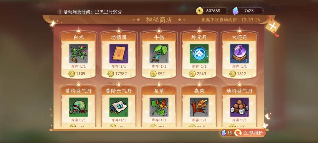 活动内容:活动期间,每天0点随机刷新商品,使用铜钱购买心仪道具,可用灵石刷新商店。