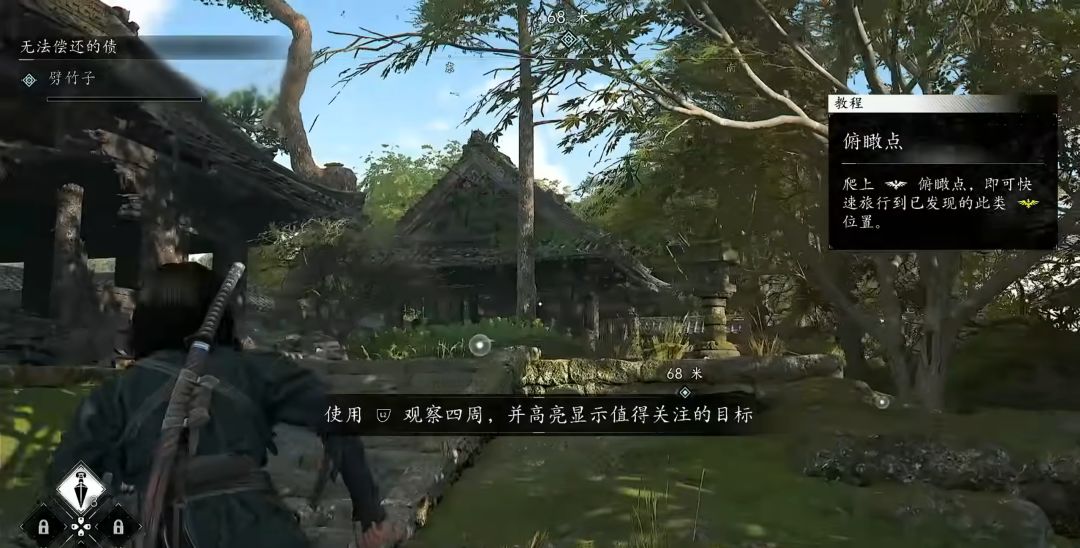 来到围墙侧边,利用物品向上跳,并使用抓钩向上攀爬