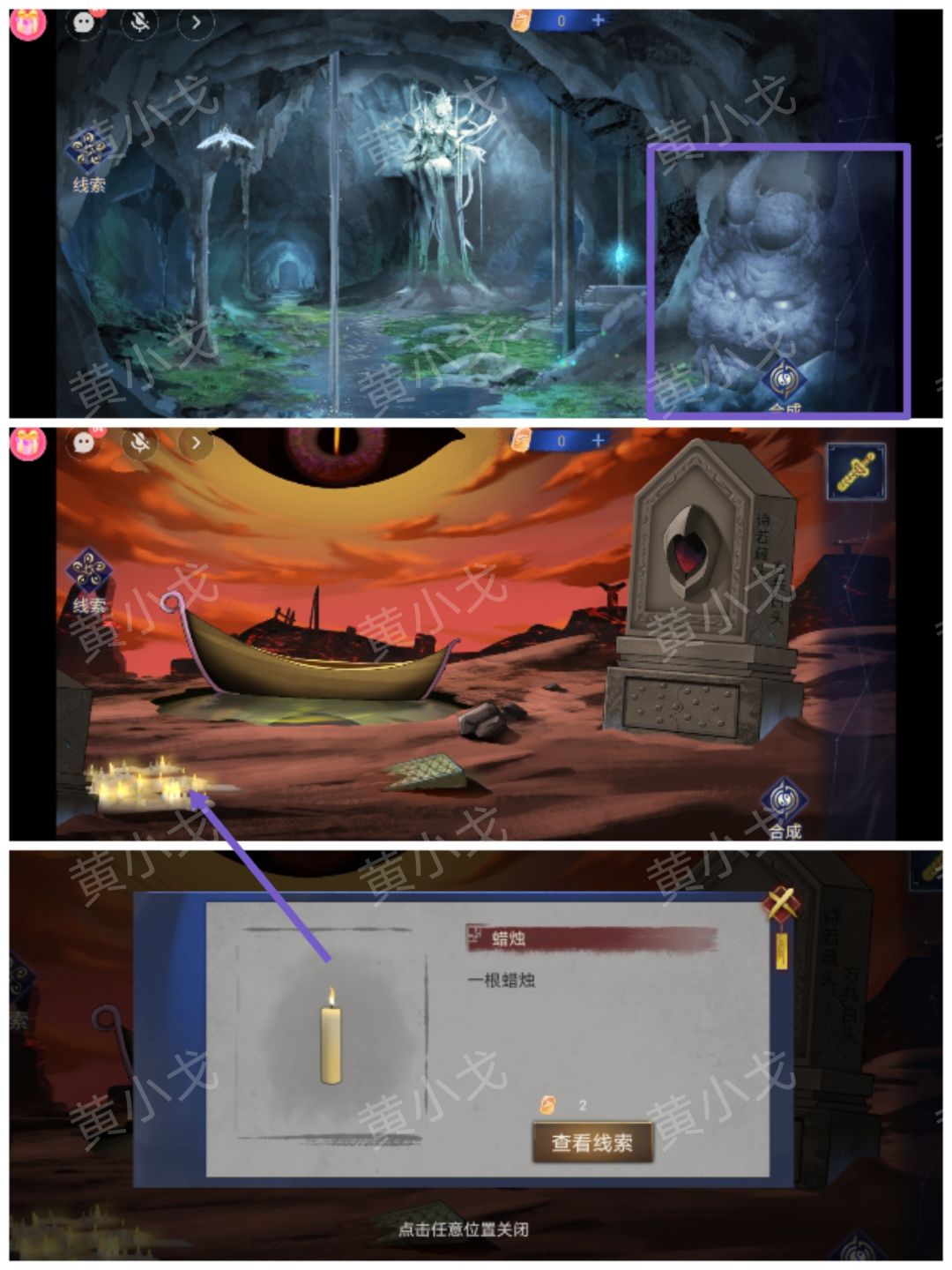 1.触摸邪神像,进入阴森之地。点击拾取蜡烛堆中的【蜡烛】
