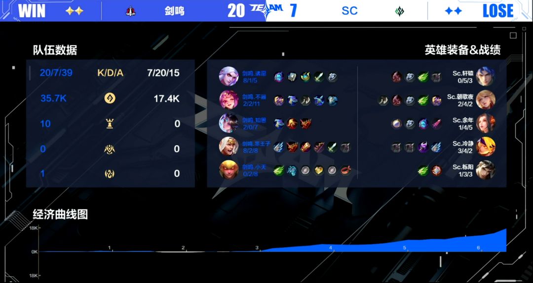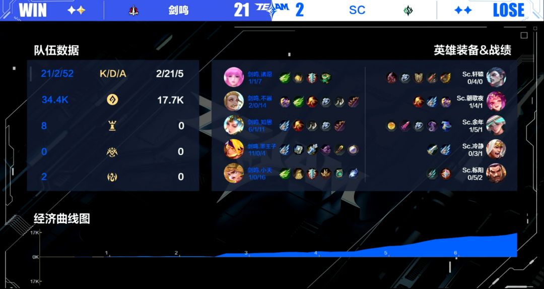剑鸣与SC展开了一场实力悬殊的对抗。首局剑鸣凭借老牌战队的经验,开局仅5分钟便建立8k经济碾压优势,SC全程丧失野区资源争夺能力,中路更在5分钟遭遇团灭溃败。剑鸣以摧枯拉朽之势于6分27秒终结首局。次局战况更为悬殊,剑鸣在5分30秒已突破11k经济差距,三路兵线直捣SC高地,最终于6分28秒完成三路突破,再度以雷霆之势结束比赛,全程几乎未给SC任何反击机会。
