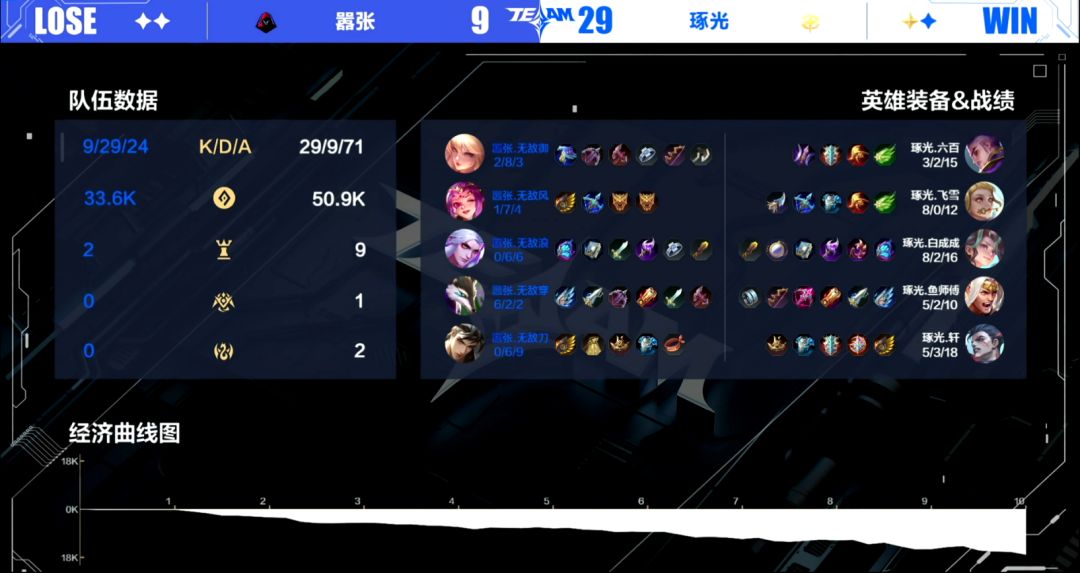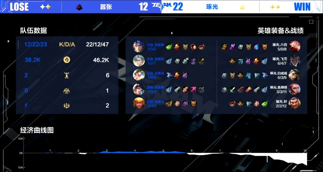 在万众期待当中,嚣张与琢光展开了三局激烈鏖战。首局琢光状态火热,开局3分钟便以7击杀、5k经济优势碾压嚣张,4分钟中路2换3后连破两塔,5分钟经济差扩大至9k,并凭借对寒冰支配者的绝对掌控,10分钟以0换3速推水晶拔得头筹。次局嚣张战队迅速调整策略,前期稳扎稳打拿下首条寒冰支配者,两条始祖幼龙均出现在中路让他们取得了巨大优势,10分钟经济领先6k后,中路0换5团灭琢光,11分钟内扳平比分。决胜局双方势均力敌,嚣张前期占优,但琢光在第二条寒冰支配者争夺中1换3逆转局势,随后选手白成成的墨翟更是在熔岩毁灭者关键团战中抢龙成功,奠定胜势,最终10分钟强攻上路高地终结比赛。整场对决中,琢光以精准资源掌控与团战执行力取胜,最终以2:1为自己积下一胜场分。