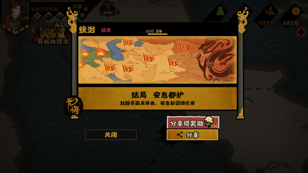 完成终局国家使命,则可宣告胜利达成普通结局——西通大秦;若同时完全所有国家使命,则可同时达成普通结局与高级结局——西通大秦与安息都护
