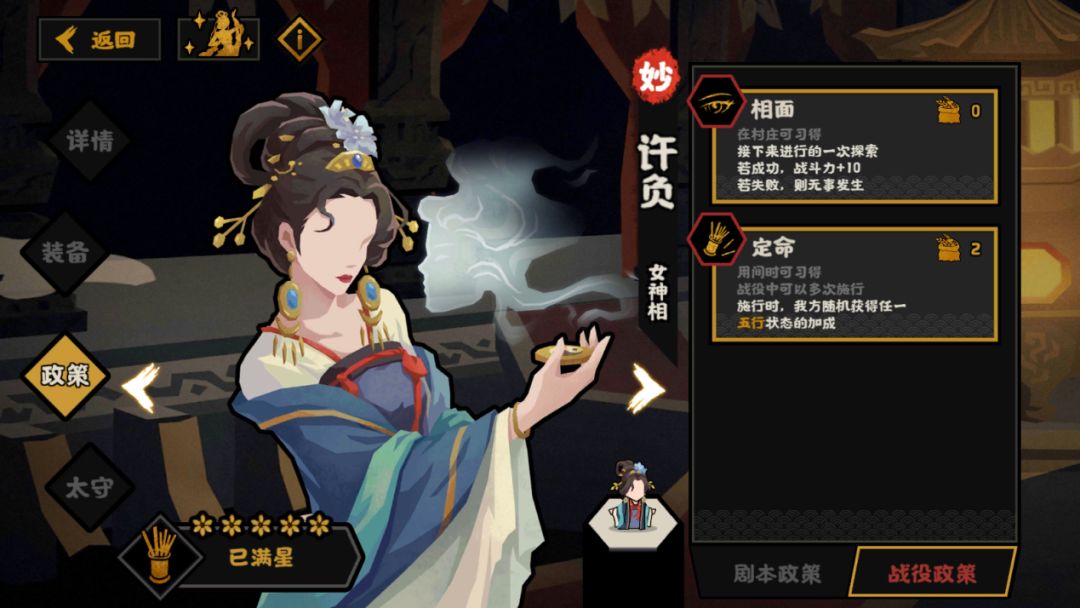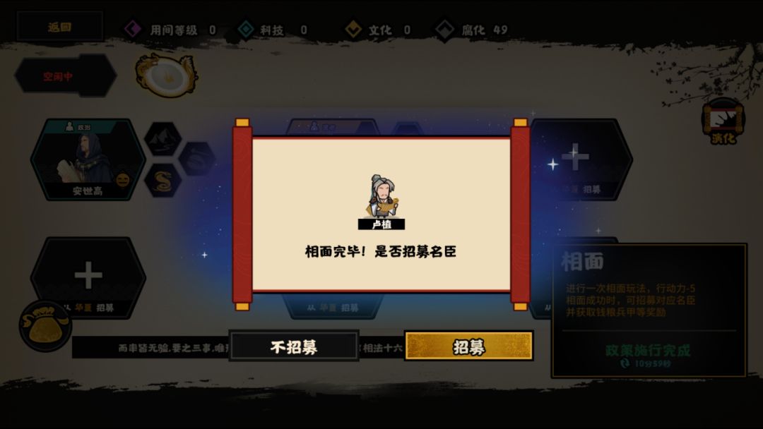政策的优点在于:会从你拥有的名臣中随机挑选五位,让你选择其一进行相面,相面成功后,可获得一定的钱粮兵甲奖励,并可招募选择的名臣,若相面失败,则只会获得一定的钱粮兵甲奖励。