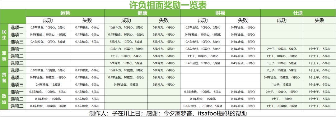 许负的钱粮兵甲奖励与相面的名臣类别以及选项都有一定的关系,具体可以参照下表: