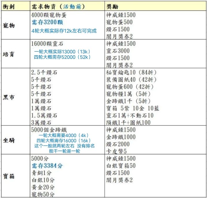 冲刺活动前需要囤满足够的物資资(这蓝字数量确保完成第一轮,每一次活动共可以完成四轮)