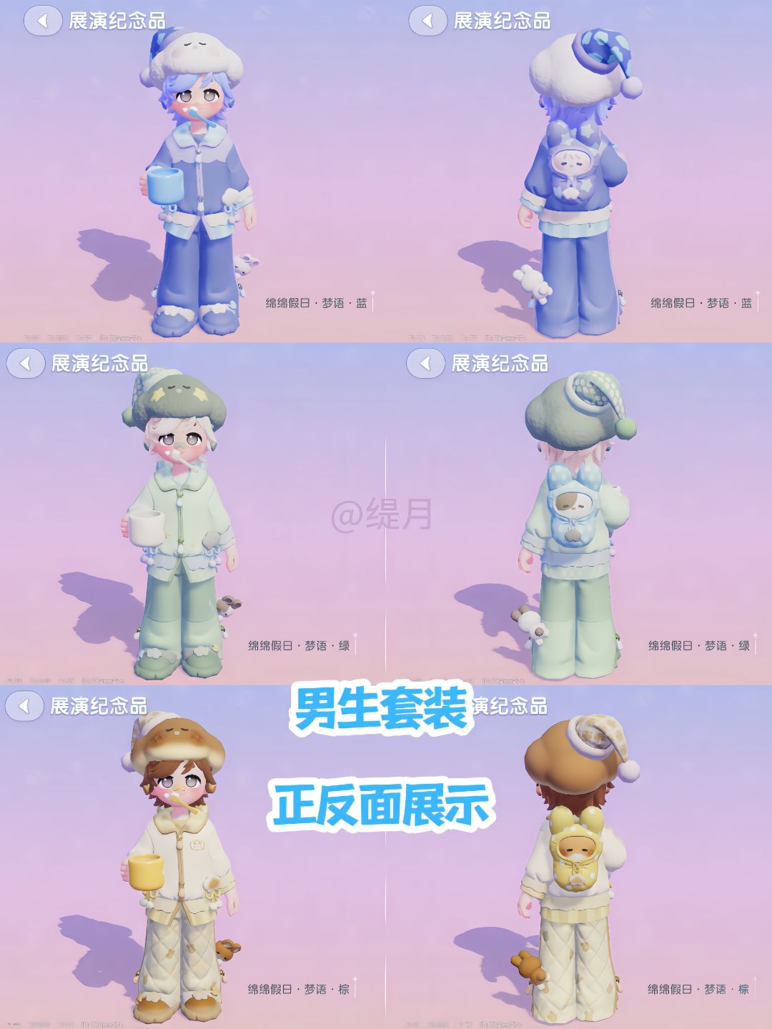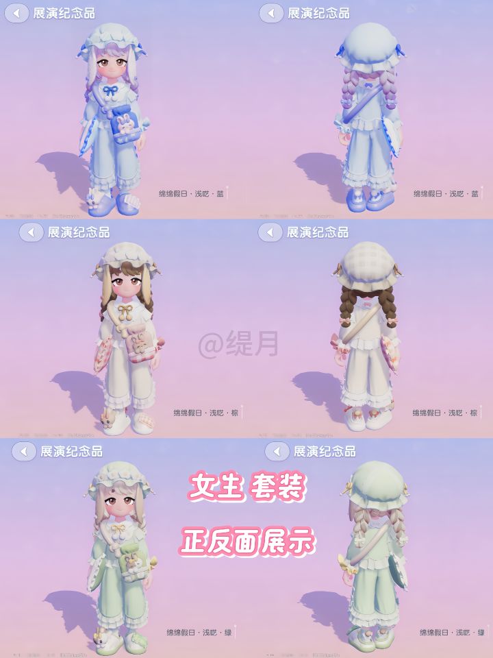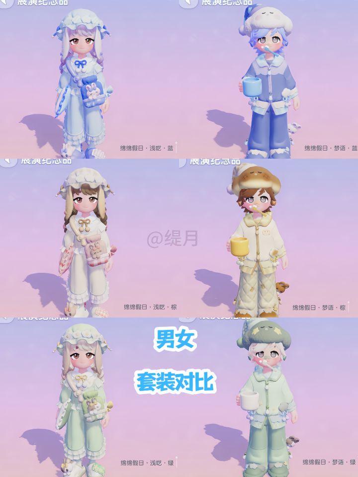 个人比较喜欢男女生的棕色系套装,女生的双~麻花辫真的超可爱,喜欢男生的入眠兔双肩包和云朵帽