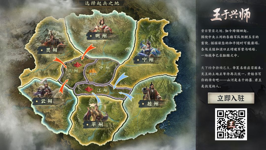 即时沙盘战略手游《王于兴师》开测在即,天下地图已送达君主帐下。群雄并起,剑指玉京,请君主商议起兵之地,运筹帷幄,决胜千里!