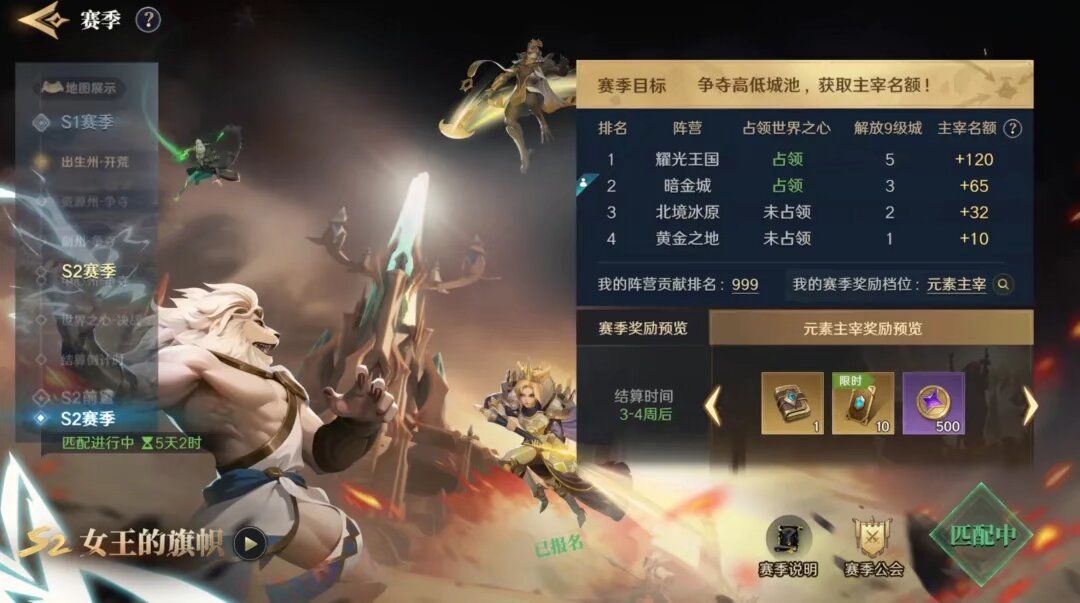 需要阵营保持占领9级城或世界之心,获得元素主宰名额,玩家的阵营贡献排名在主宰名额范围内,即可在赛季锁定结算后,获得元素主宰奖励,在下赛季领取。