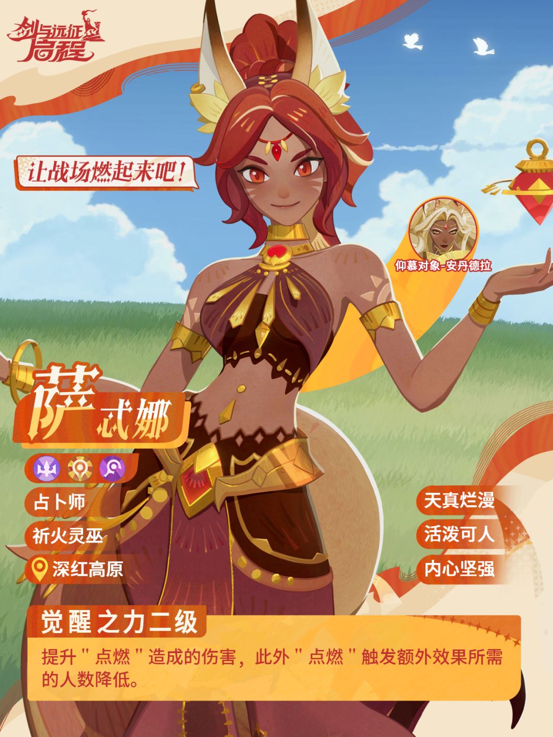 本次觉醒提升的英雄有:天真烂漫的祈火灵巫萨忒娜和残忍的班题斯之鞭斯莱泽。