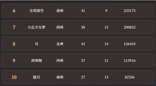 看完前5的盟之后我们再来分析一下前10中的后5盟,可以看到依旧有尘埃势力的身影,尘埃深空盟可能是因为身处南州,被剑来盟制衡住了,很难像东州、北州的尘埃势力盟一样发展成霸主趋势。