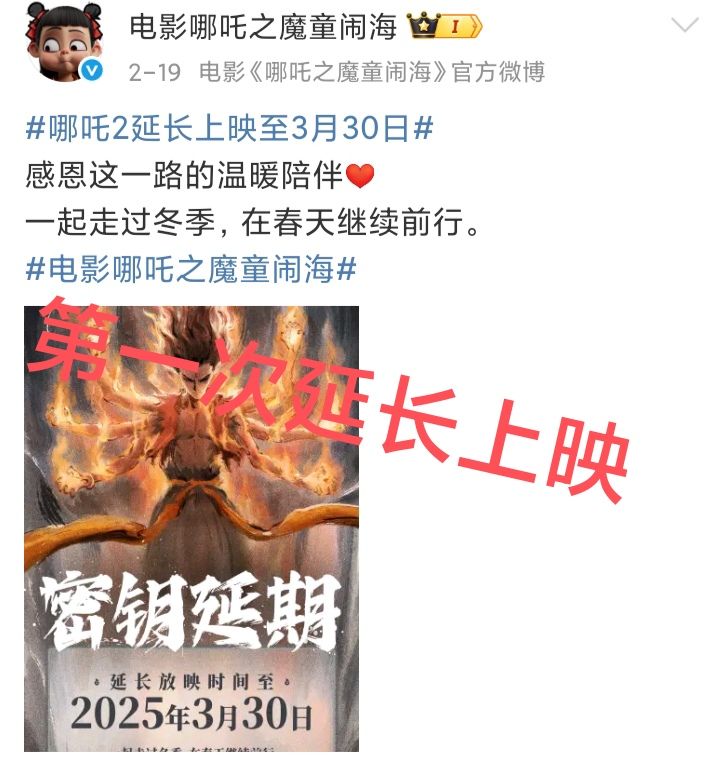 3/21号,《哪吒2》官方发文,宣布电影延长上映时间至4月30日❗❗❗