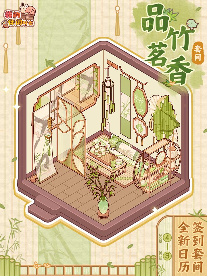 📅全新签到套间「品竹茗香」即将于4月上架「日历」App!小蜗可以在「手机」-「日历」中完成签到领取当日奖励,每月累计完成25天签到还可获得当月对应家具噢!更多详情戳下图查看👇