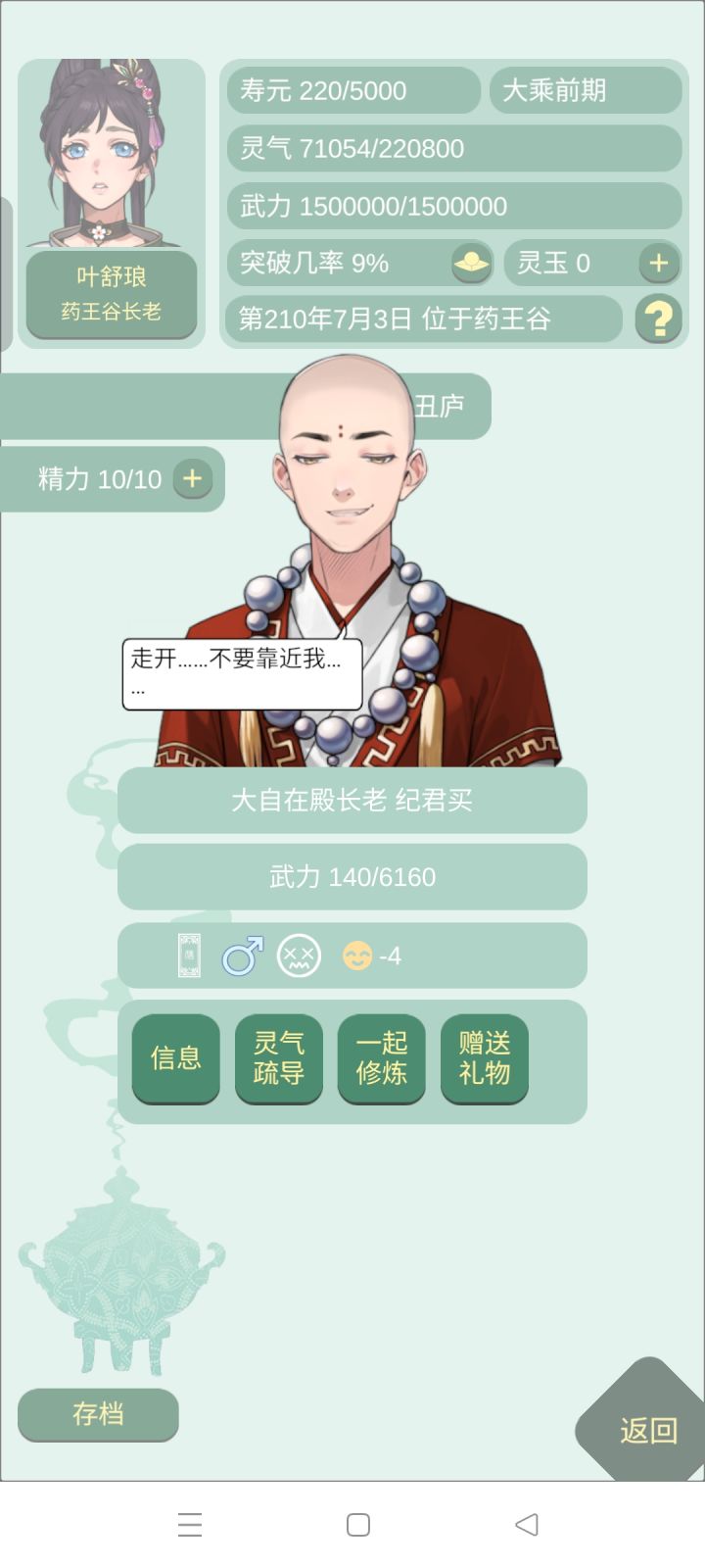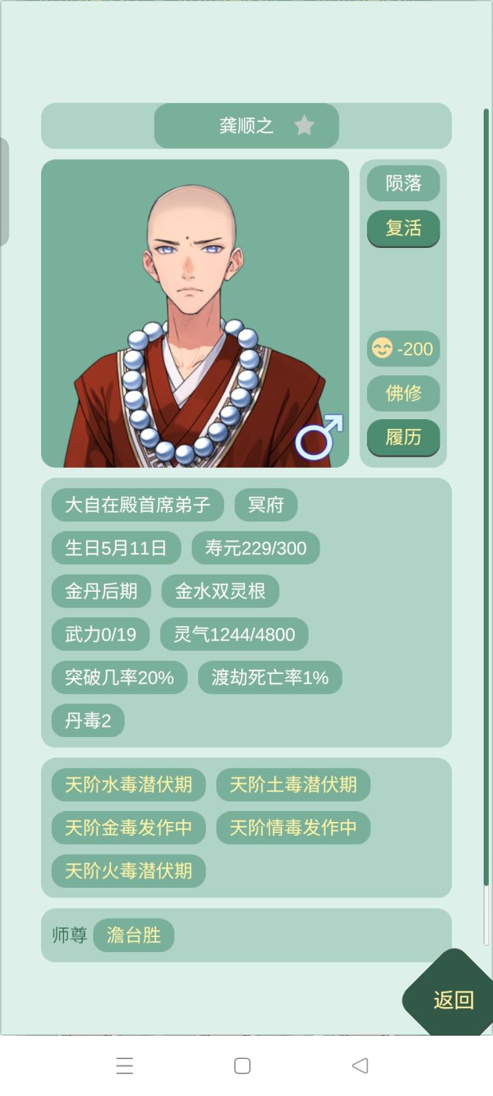 如何有效利用10次发情毒的时间,实行快速和尚通,但是并不能产生感情和生子。可以重复叠加下毒,好感度刷满100以后保留10体力,然后登门拜访,注意选中的和尚最好在元婴及以上,不然可能直接死掉(没试过)。先下两个天阶水毒和土毒,因为这两个都会直接进入潜伏期,不会降好感,然后下天阶情毒,注意下毒的过程中旁边最好不要有人,否则会架着和尚直接跑。然后点一起修炼,修炼完了以后再提出治疗,因为好感度一开始是100,所以这个时候只会是-1,他可以接受我们的治疗,然后先治水毒,再治土毒,因为水毒的发作期要比土毒的发作期要短(你也不想治土毒的时候,突然他的水毒发作,但是你又治不了,然后死掉吧,而且水毒和情毒同时发作的话,那么以水毒优先,所以也点击不了一起修炼)。然后就可以利用他在药炉我们给他治水毒和土毒的时间来蹲他的情毒发作时间,然后给他疏解情毒,当把所有的毒都治好,应该是可以逐渐提升好感的可以白p(也不算,毕竟我们炼制毒药还要时间)。其实下一个其他的毒就够了,只要把控好时间是可以让毒不发作也可以让我们白p到的,比较提倡土毒吧,土毒要300多天才发作。但是不要下其他毒,因为其他毒就直接发作了,这样的话好感度一旦下降到很低,那么他会拒绝我们的治疗,然后你就再也找不到他人了,他就死在某个角落了。当然我还没有白p完,这只是个实验,所以先选一些相貌普通的和尚来实验,后续我会反馈一下结果#某某宗女修修炼手札 #药王谷谷女修炼手札 #和尚。希望能够帮助到大家!