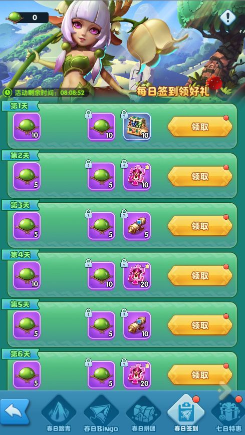 🌱春日签到:活动期间,每日登录,可以领取一份登录奖励,购买登录礼包可额外领取一份珍稀奖励