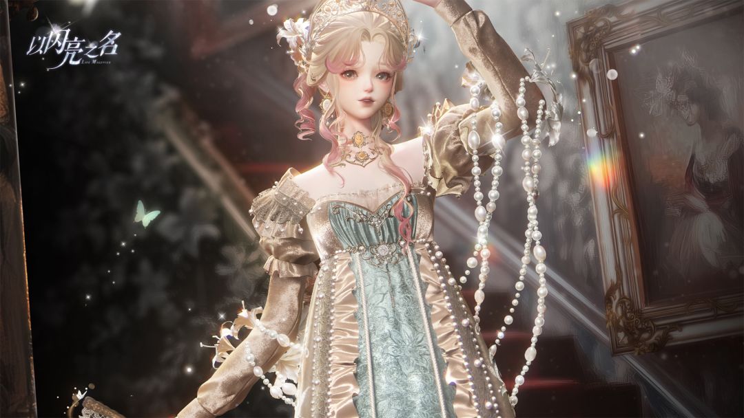 手持扇子可开合,扇面与裙身使用繁复的百合蕾丝花纹相呼应,同时扇子带有蝴蝶飞舞的特效,丰富帝政裙的氛围感。
