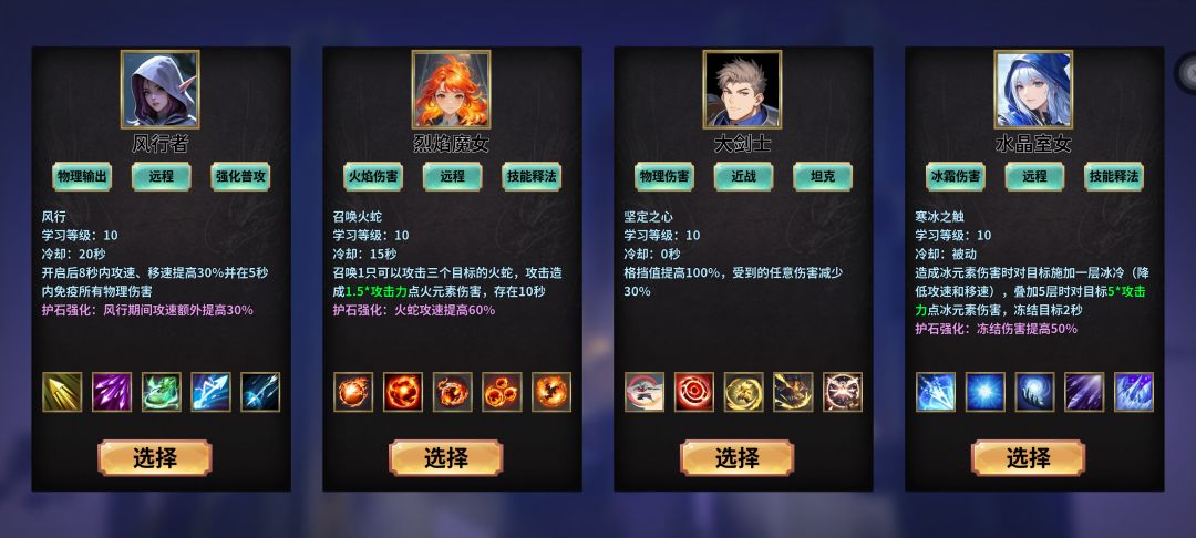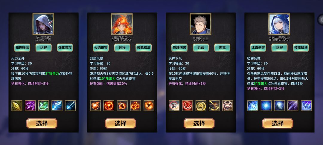 游戏有4角色可供选择:风行者(射手),烈焰魔女(火法),大剑士(战士),水晶室女(冰法),选角色界面可自由选择,觉得哪个不行直接选角色界面选择你认为最强角色即可,这点很不错,比如火法,冰法,射手打不过的图,换战士就很可能打得过,因为战士的被动能让你格挡值提升100%,减伤30%,一直生效,能让你扛住BOSS的一顿胖揍。