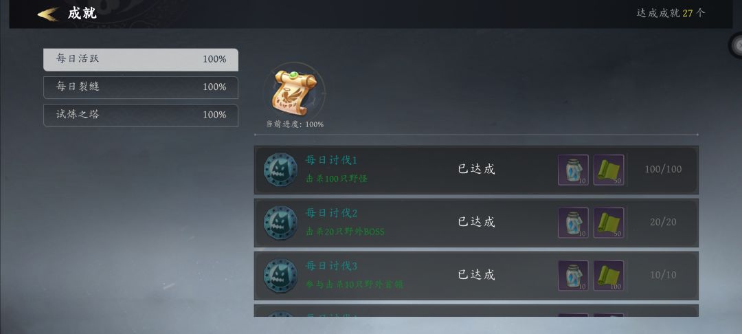 答:还有每日成就,分别为:每日活跃,每日裂缝,试炼之塔;