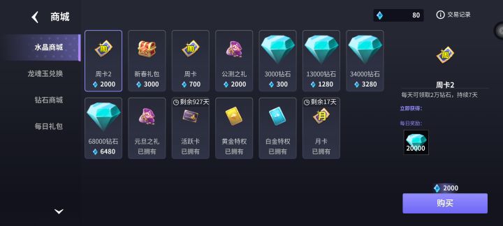 ⑨周卡2,2000水晶购买,每天获得20000钻石,持续7天,累计140000钻石(7天)