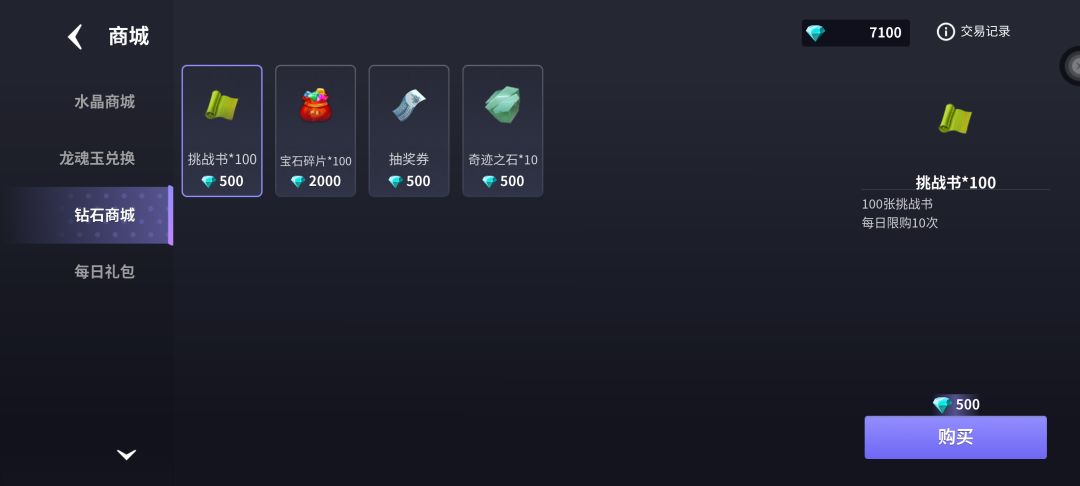 抽奖券:抽奖里面抽取龙魂玉,宝石碎片,挑战书,金币,平均80抽奖券抽取1龙魂玉,商城购买价格为500钻石1张抽奖券,10连抽保底100挑战书或100宝石碎片,运气好200宝石碎片+200挑战书也有可能。