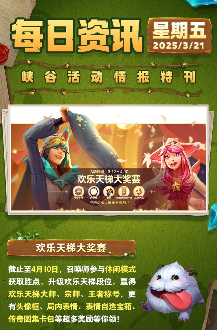 符文大乱斗火热进行中!截止至4月10日,召唤师参与休闲模式获取胜点,升级欢乐天梯段位,赢得欢乐天梯大师、宗师、王者称号,更有专属头像框、表情、传奇图集卡包等奖励等你赢~