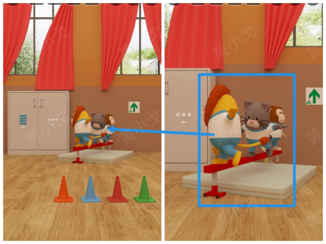 28.点击推车上的密码锁,根据[垫子]场景动物拉伸高度线索,调整密码锁