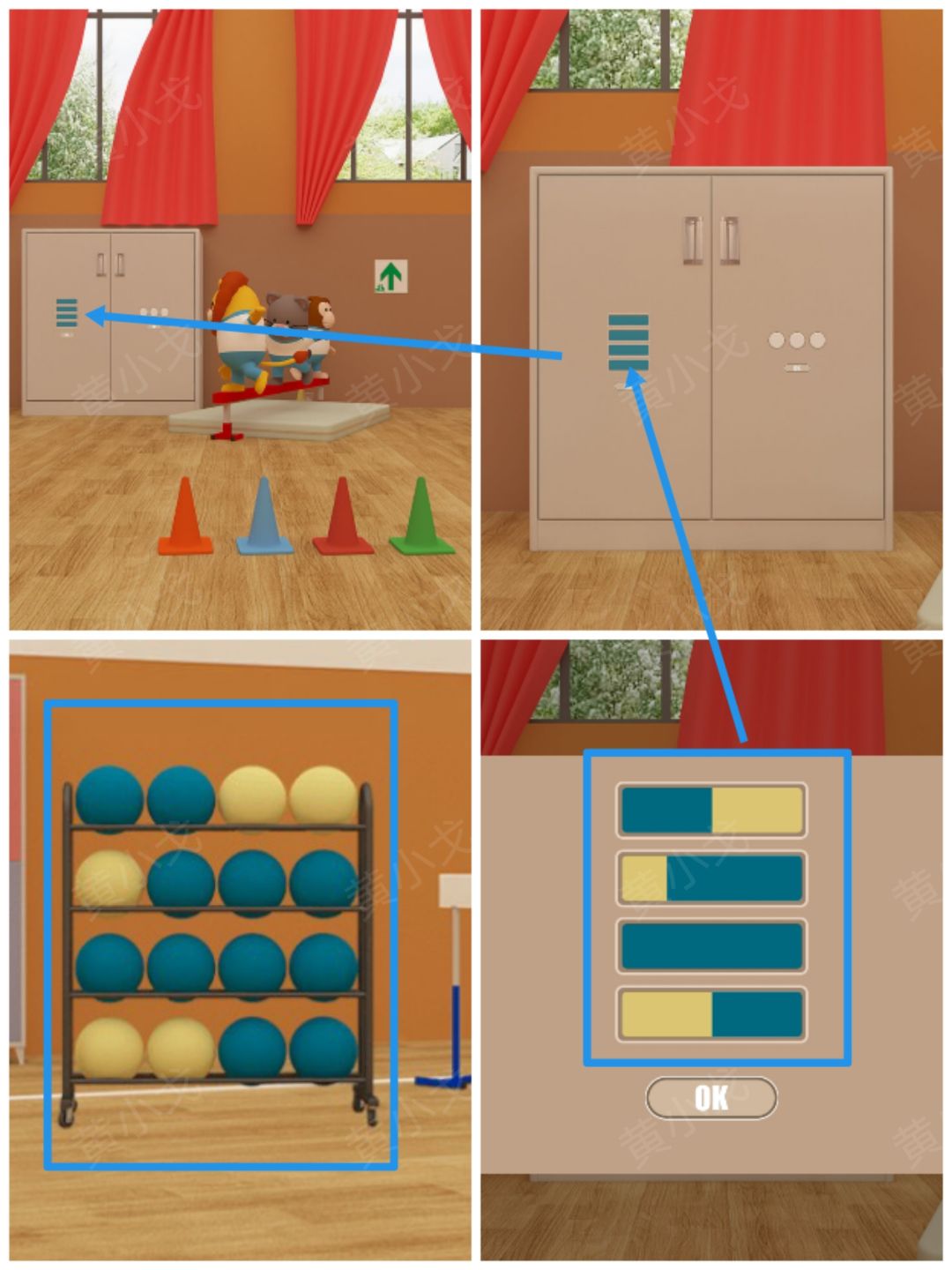 33.点击柜子右侧柜门上的密码锁,根据[排球场]场景动物击打排球高度顺序和[篮球场]三只动物跳绳的高度线索,按顺序点击密码锁上的按钮