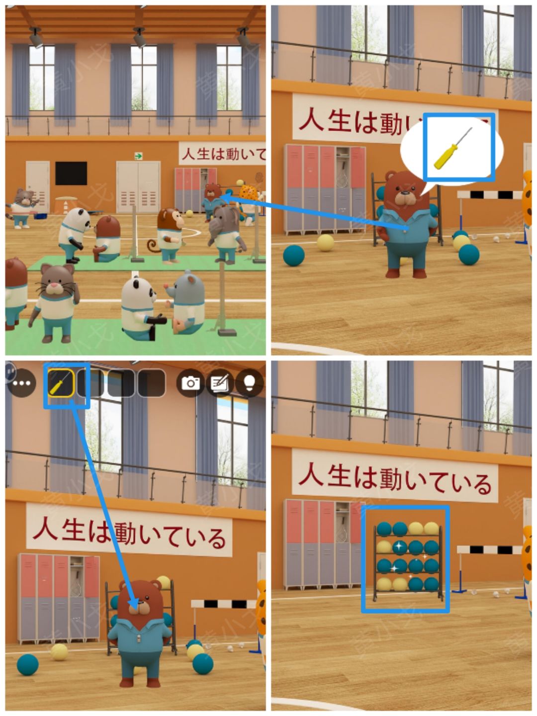 6.点击收纳柜前面的熊大叔,得知他需要螺丝刀;拿【螺丝刀】给他,熊大叔把球捡起来,观察球架上的球