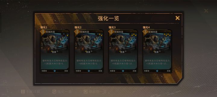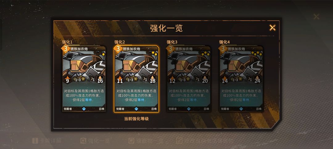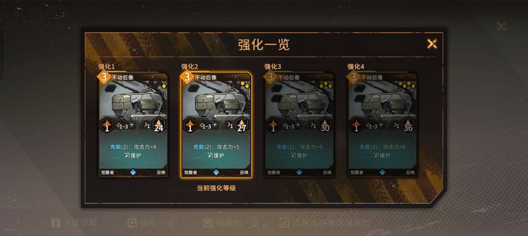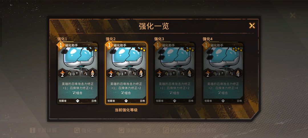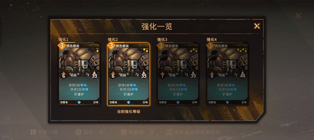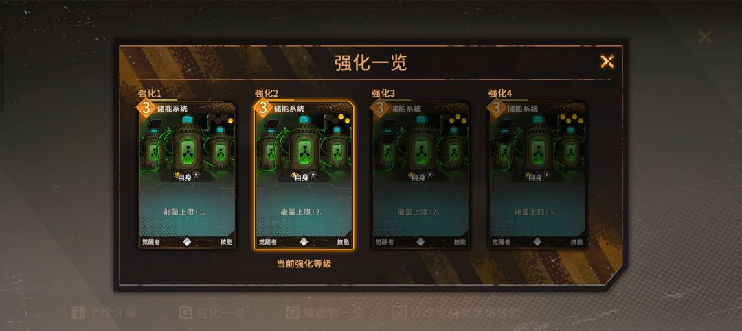 组合牌里,带屏障和减伤的这两张,就和组合这个词条一样,在觉醒者里很百搭。军械和储能系统,前者是全体强化,后者是增加能量上限。这些牌,在前期都比较容易入手,且实用性高。卡牌就算突变出耗能行动,也能很快再突变一次。不至于像紫卡和橙卡一样,因为缺少解码板突变把自己气上火。