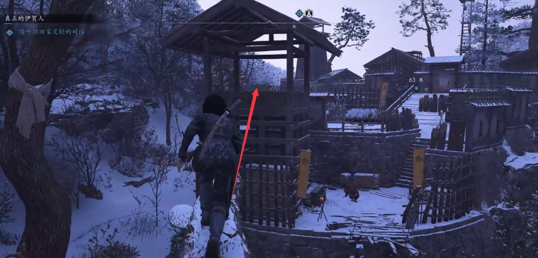 和三太夫对话后,走上树枝,用钩绳潜入营地。注意你现在是在回忆中,还没有袖剑,所以无法刺杀敌人。
