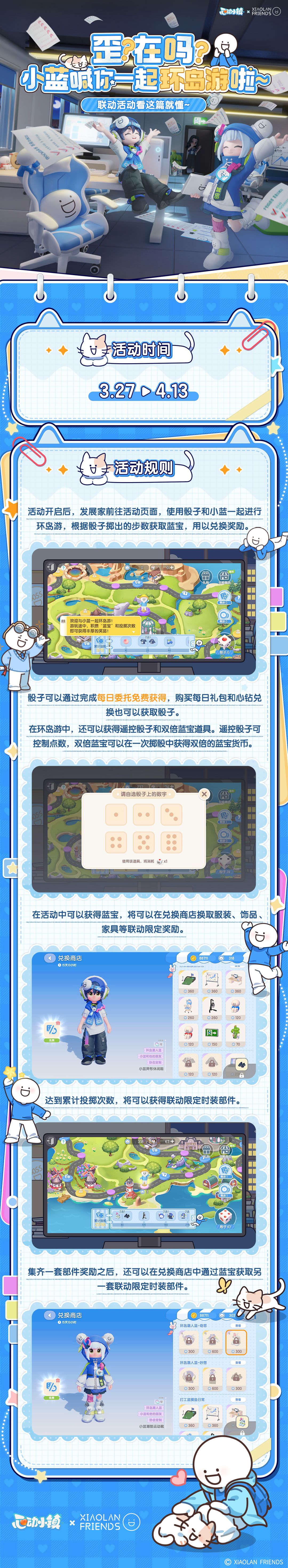 3月27日至4月13日,小蓝和他的朋友联动即将开启,和小蓝一起环岛游的春日时光要来啦~