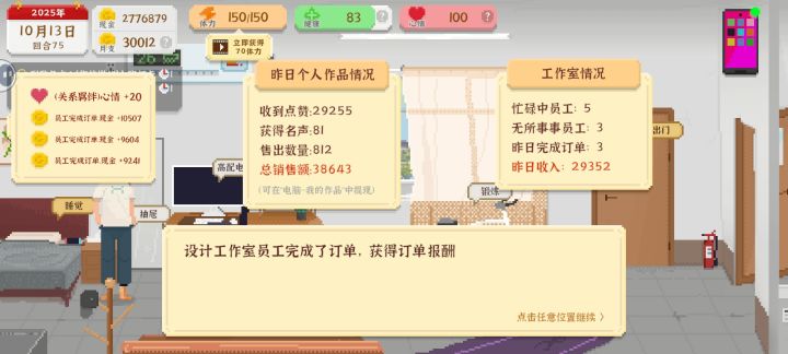 个人推荐前期刷美术(艾薇:兴趣讨论、广告店:哪个工作加美术加的多选哪个、看书、做设计)。等美术到1000左右考虑开工作室,还可以上学校的补习班(这样攒的比较快)。看广告的体力必须加,网购里的赚现金看情况(运气好的话不用)主要刷“年少有为”成就。