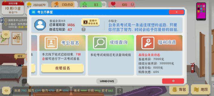完成五万任务后,开始考公务员(配件全买好),10个回合内题刷到5000,基本就没问题了。考上之后就按部就班的刷钱(我是设计、公务员工资两头拿)暂时还不知道哪个更多