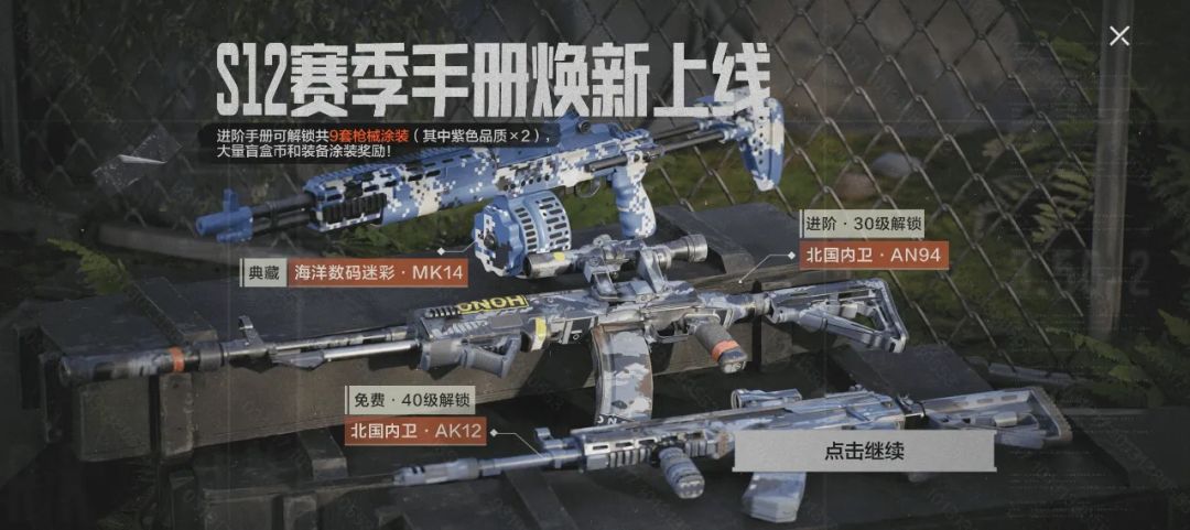 本次的赛季手册枪械涂装主题为北国内卫,采用蓝色迷彩系列的设计,贴合主题名称。达到指定等级后即可领取【北国内卫·AK12】枪械涂装,购买进阶手册后达到30级即可领取【北国内卫·AN94】枪械涂装,解锁典藏手册还可获得【海洋数码迷彩·MK14】枪械涂装!