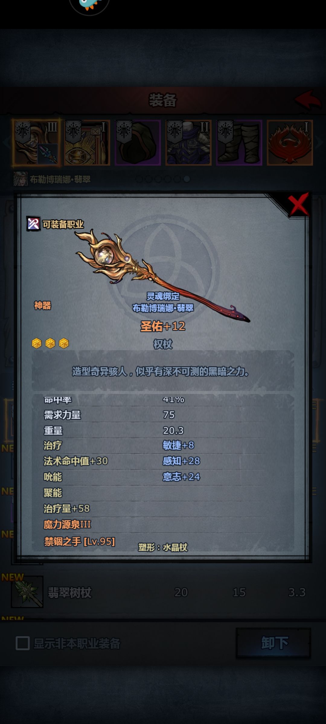 1.权杖∶我个人推荐“恶魔的祈祷”,有法术命中。强化路线走吮能和加法术攻击力都可以。