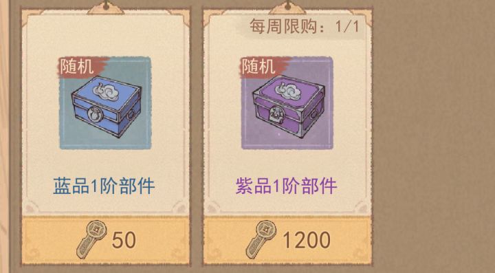 (前期行商时间长,20个小时行商只有40个戎车宝钱,资源有限,只够每周购买1个紫色箱子,购买紫色避免资源浪费,后期配件产出变多则无所谓)