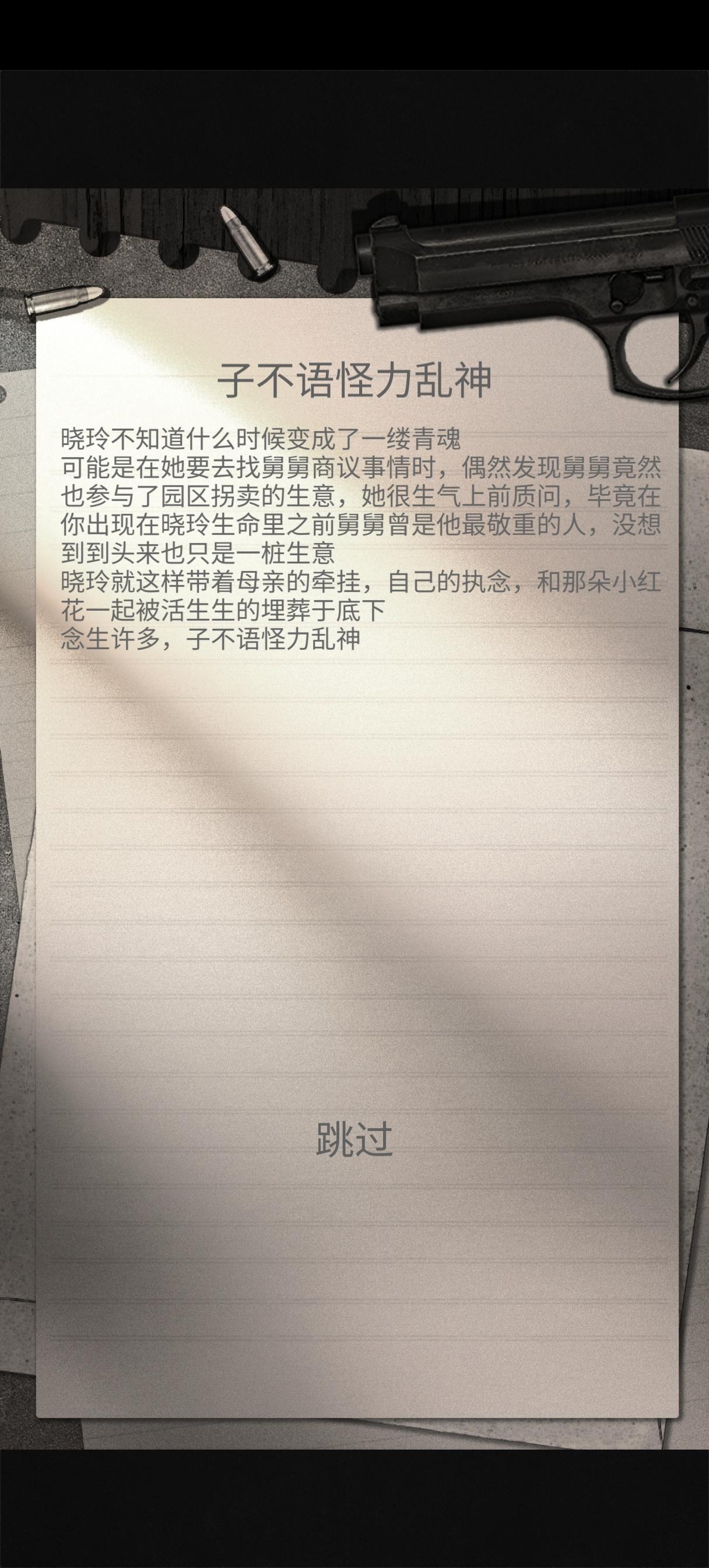 一个扎心的事实是,即使在晓玲的HE(官方定义的HE)“子不语怪力乱神”中,她也难逃香消玉殒的悲惨命运(结局文字“被活生生地埋葬于底下”暗示是被舅舅活埋了,而打手一下子就发现见鬼了,暗示打手参与了活埋),只是心存执念的她以残魂姿态,一己之力吓走了来势汹汹的打手,最终护佑着主角成功脱逃。当主角安全后,才发现晓玲原来早己消失,一路陪着主角的“只剩下一朵干枯的小红花”,简直让人想哭。