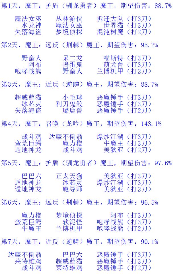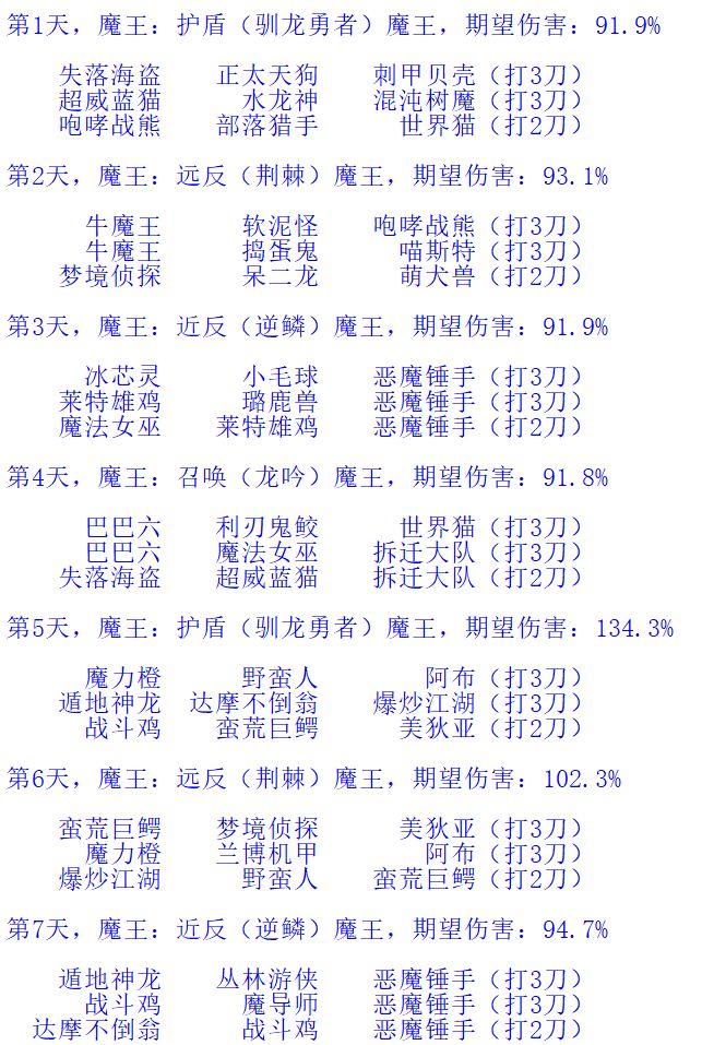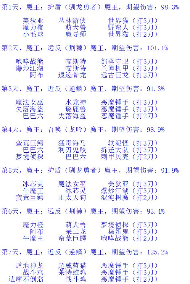 每一天后面的百分比代表当天伤害相比七天平均伤害的百分比。各个方案的七天平均伤害也都差不太多。