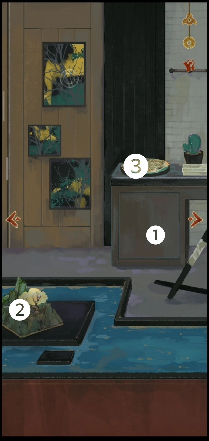 ①②③猫抓板3个按钮,蓝色抽屉里有一枚按钮