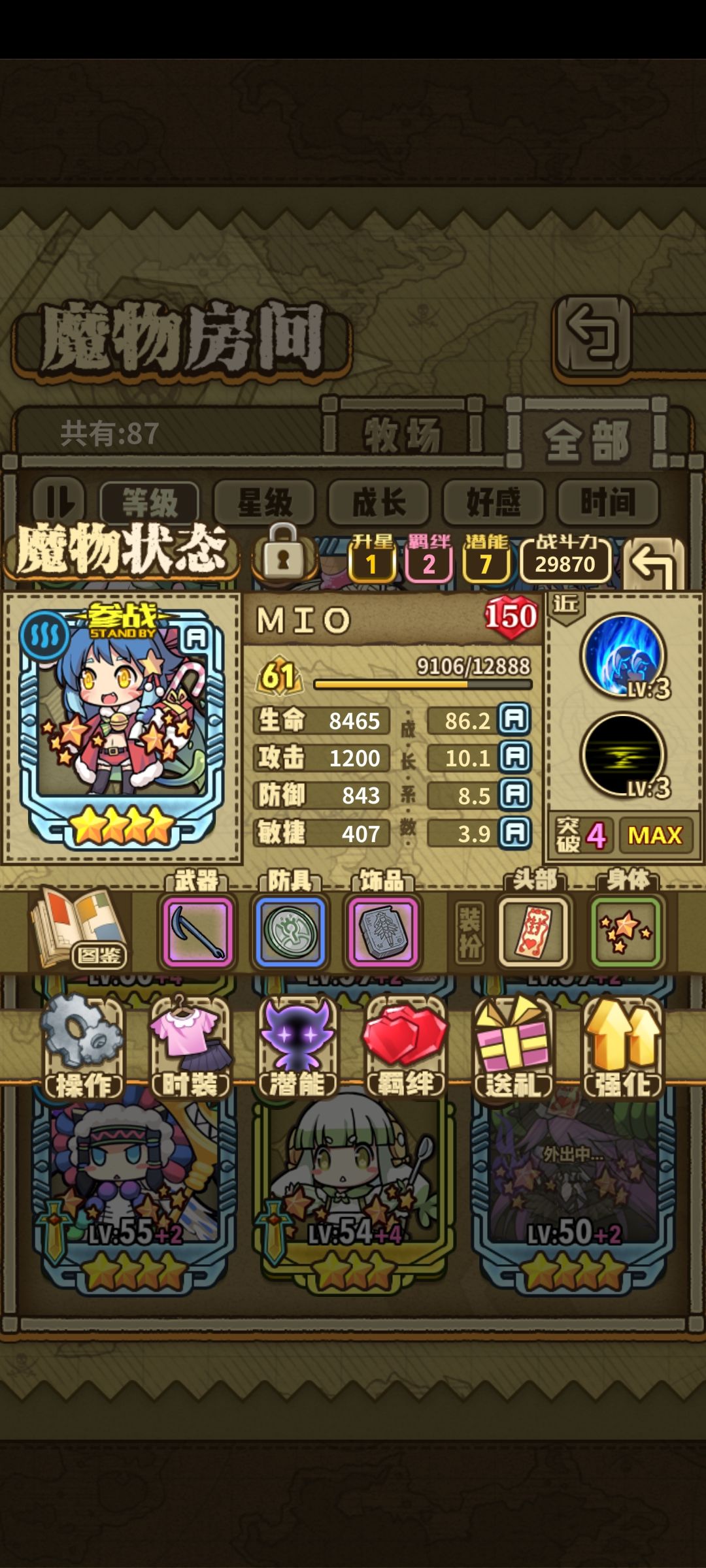 最后出场的是我们的MIO!作为我们的初始魔物,剧情里又是必不可少的主角团核心成员,MIO的伟大无需多言,不过话说回来,游戏里的强度那是没有的,不论前中后期都是可有可无的,大蹦移动实在太垃圾,技能输出也不高,唯一可能高光点是拜耳登B-14的小史莱姆了,前提是升星MIO![[嗒啦啦4_坏笑]](https://img.tapimg.com/market/images/644c03a7456ff71d7b6b6a919b2d8817.gif)