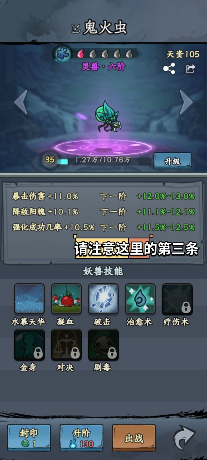 我们可以看到,这只鬼火虫基础属性只有三条,比猛犸象少一条,第三条是,强化成功几率,聪明的小伙伴可能已经想到了,没错,我们就要它的这一条功能。
