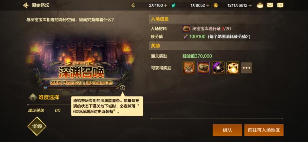原始祭坛相当于全新的深渊地下城,地图同样分为2个房间,每个房间消耗2点疲劳,入场需要消耗全新的深渊门票“秘密宝库通行证”20张。