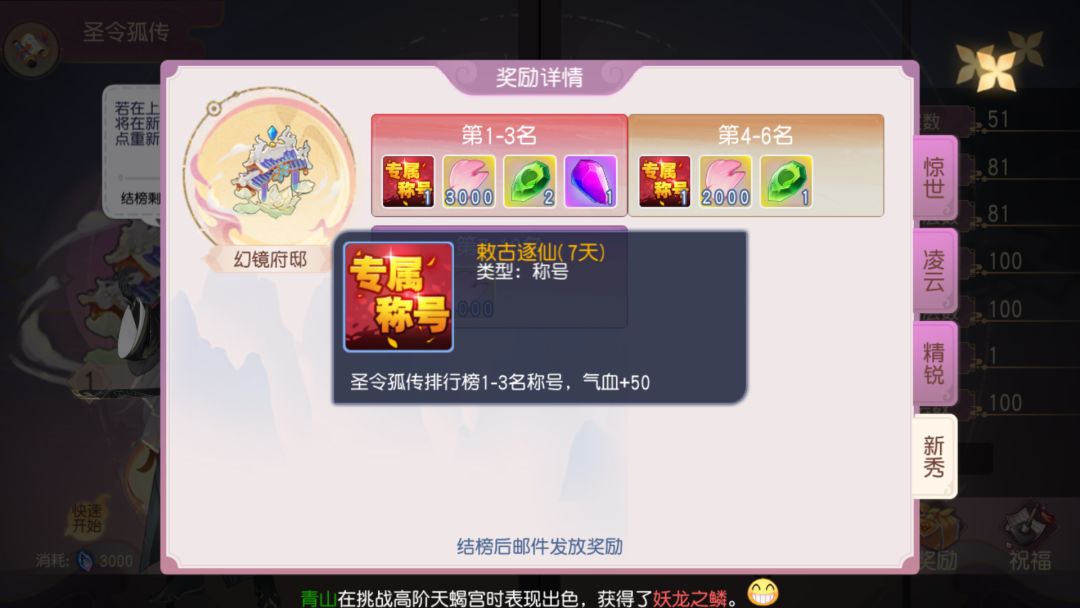 排行奖励,给勤劳的小伙伴们~~~咱先不说那3000神赋碎片、1个强化保护石、1个紫色神赋精元,就这一个橙色称号,那格调一下子就上去了,况且还加了50点气血!