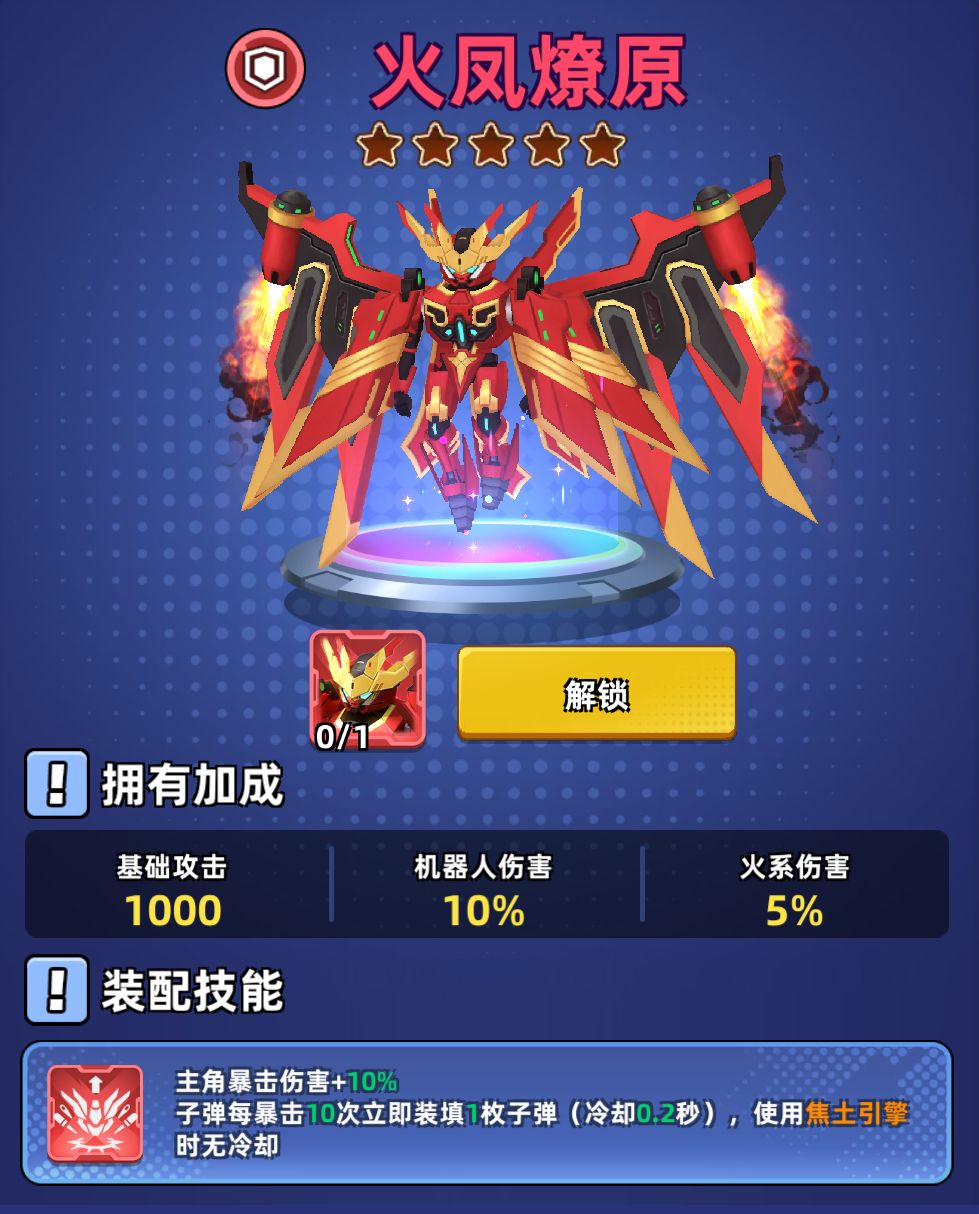 暴烈凤凰号皮肤-火凤燎原登录战场,焕然一新的机甲造型,炸翻全场!参与机器人抽奖活动以及助力活动,即可有机会获得全新机器人皮肤,让你的机器人拥有全新外形的同时,获得专属的皮肤技能,大幅增强实力,让你在战场上势如破竹!