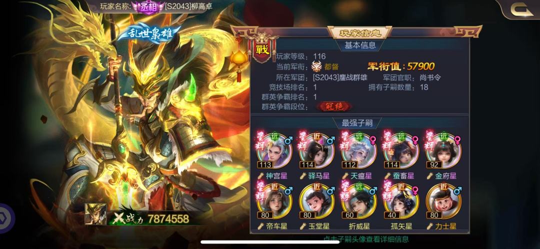 各位主公上午好!又是一个月的时间未见面,不知道各位在座的彦祖有没有想念小攻,在这春野浮绿,万物新生的春季,愿遗憾随冬雪消融,期许伴新芽生长。在这个繁忙的周一,我们邀请到了第21期攻城名人堂的大佬,在本服攻城世界里的战力引领者,名列前茅的实力不言而喻,他就是来自S2043区服的大神—柳高卓,下面就跟着小攻的视角来看看吧