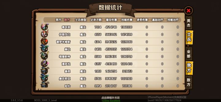2 其次观察boss两个核心的技能,首次攻击以及首次全场控制以及秒杀特性(沉默 变羊、降低防御、增伤都是不生效的)秒杀特性决定了方阵英杰的血量不能过于低(萨拉的效果回复会更好一些)
