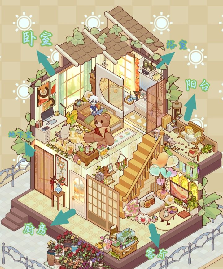 (电视机对面会有沙发,但游戏里面放不下而且背面沙发和整体布局有点不搭);阳台:从楼梯上去就是阳台,可以坐在阳台沙发上看风景;