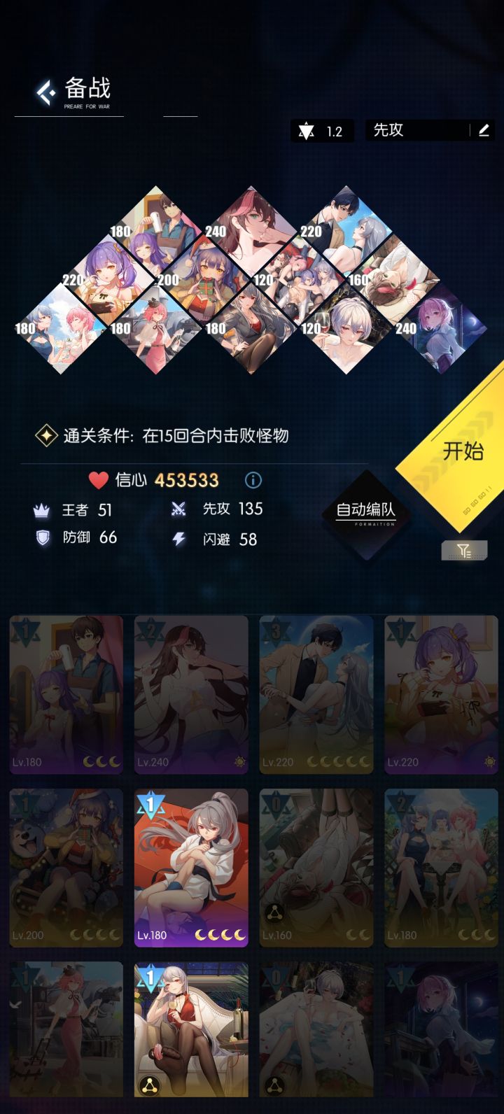 晒一下主要阵容,先攻流,装备是3个金先攻+3个红先攻。打法就是叠一堆buff,然后三人+一生收割。主线大部分怪肝一下排序和三人的连击基本就能过了,12 13章会有一些143先攻怪,需要调整一下牌凑到143先攻也ok了(我是换下了一决和五人)。